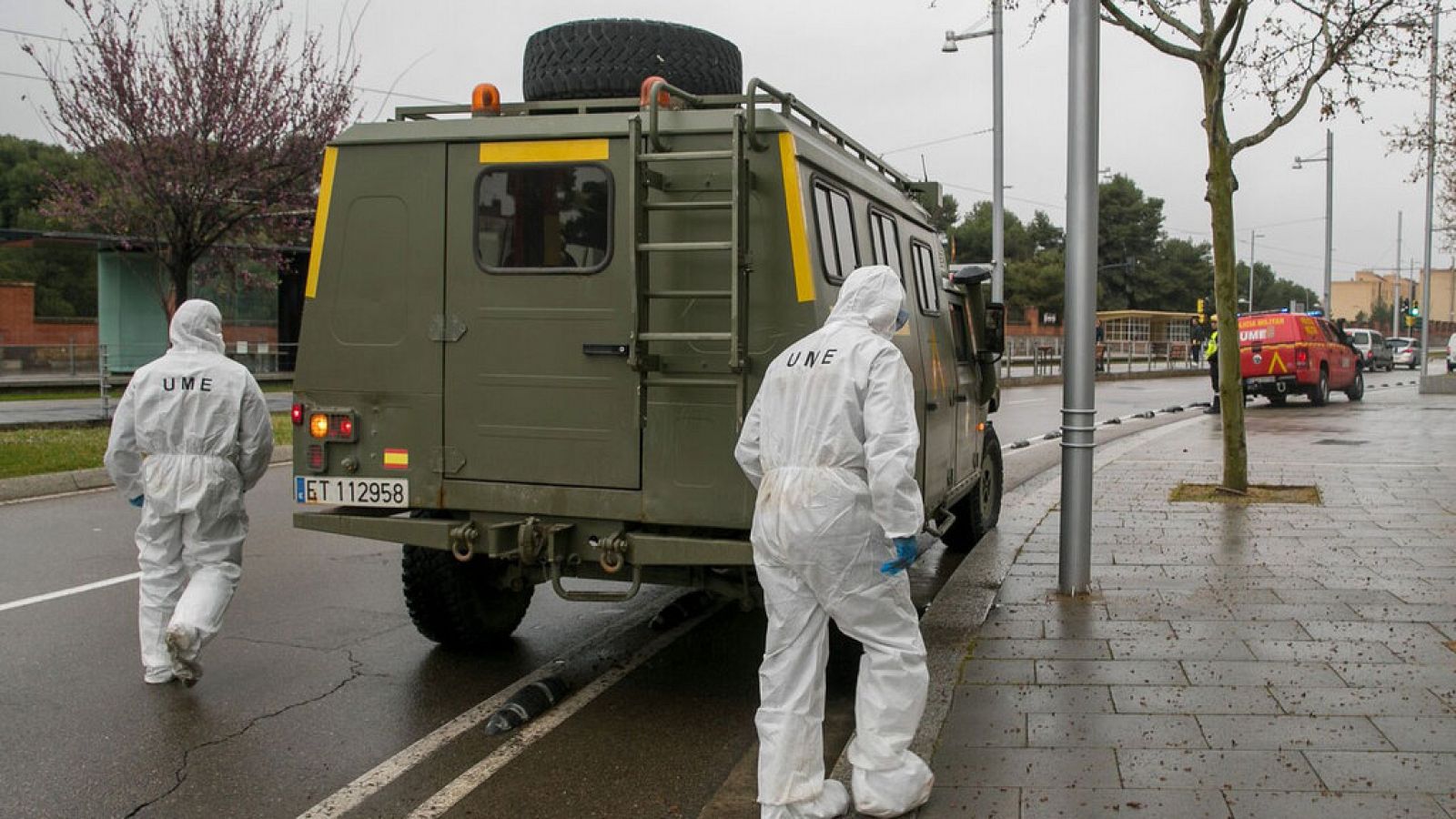 Dos miltares de la UME en Madrid realizando tareas de desinfección
